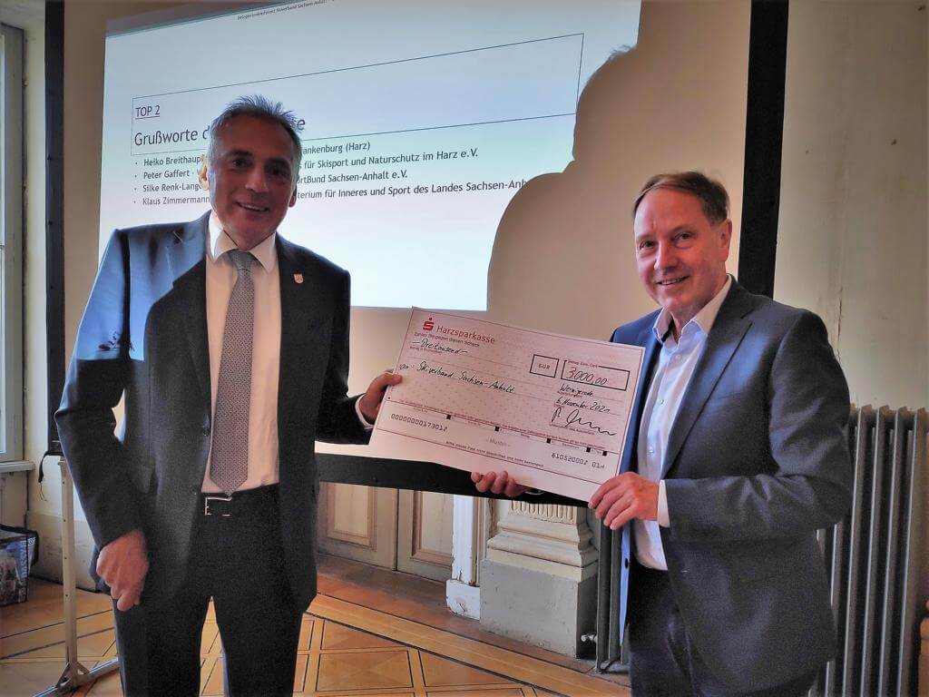 Im Zuge dieser positiven Entwicklung, die anfangs von vier, inzwischen von 15 Sportlerinnen und Sportlern, die an den Eliteschulen des Sports bzw. an den Bundesstützpunkten trainieren und weiter für Sachsen-Anhalt und ihre Heimatvereine starten, wurde auch die Begleitung des Projektes durch den Deutschen Skiverband diskutiert. Hier stand die Einstufung von Wernigerode / Schierke als „Herausgehobener Stützpunkt des DSV“ im Mittelpunkt der Diskussion. Die Delegiertenkonferenz stellt hier nochmals die Notwendigkeit einer ganzjährig nutzbaren Sportloipe in Schierke zwischen Parkhaus und der neuen Rennschlittenbahn heraus. Zur Unterstützung von innovativen Projekten im SVSA übergab der Vorsitzende des FVSN Peter Gaffert einen Scheck an den SVSA und nutzte die Gelegenheit, um auf die Bedeutung des durch den FVSN wiedereröffneten Loipenhauses für den Breitensport hinzuweisen.