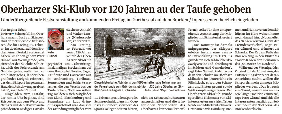 Ostharz sowie Interessierte zu einem Festakt anlässslich des 120-jährigen Gründungstages des Oberharzer Skiklubs ein. Die Veranstaltung beginnt am Freitag, d. 19. Februar um 11.00 Uhr im Goethesaal auf dem Brocken.