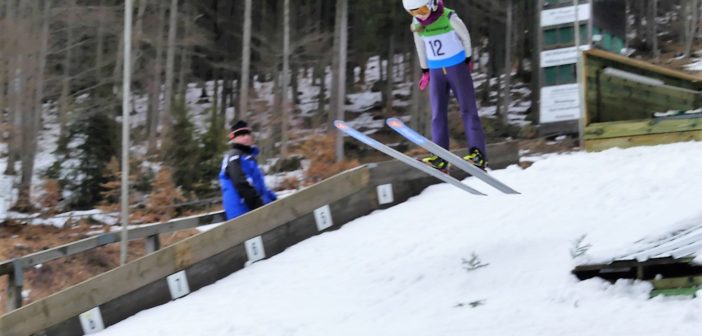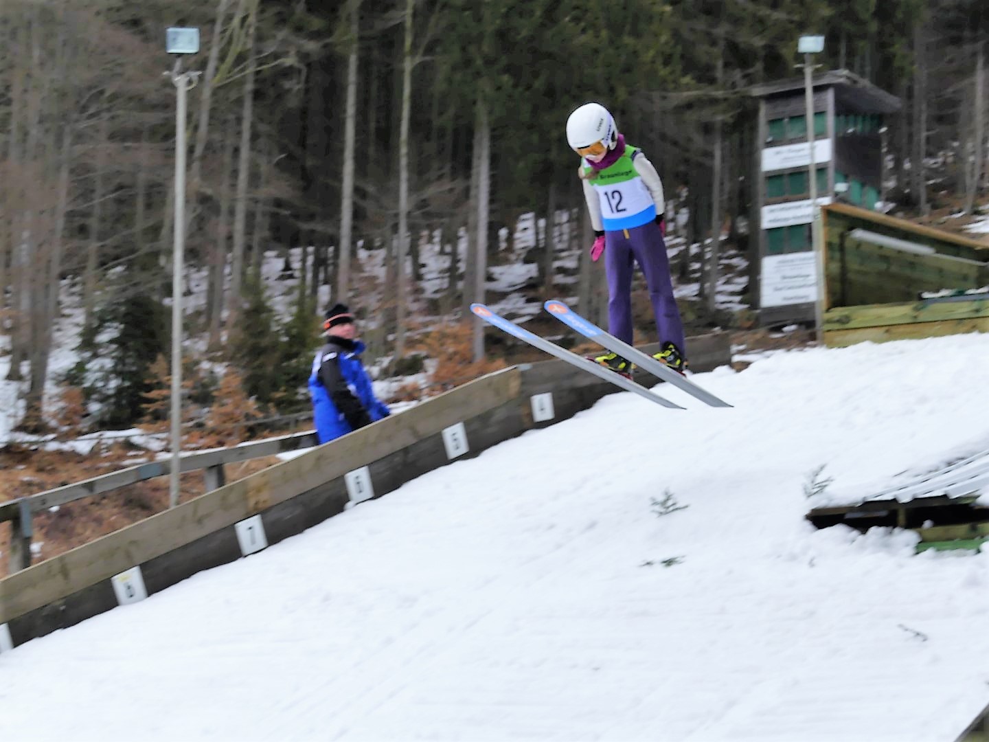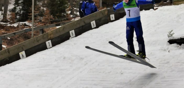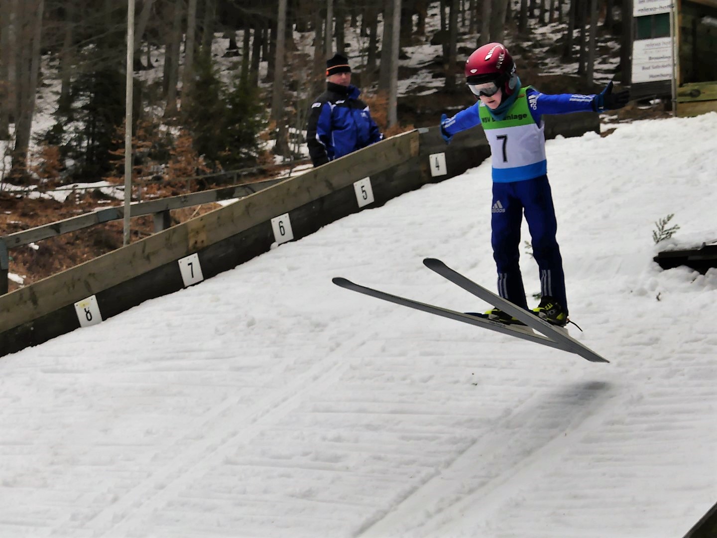 Eindrucksvoll mit Tagesbestweite im ersten Durchgang von 5.5m auf der 7m-Schanze kehrte der 6-jährige Frieder Stoor nach krankheitsbedingter Pause zurück. Im zweiten Durchgang erzielte er ebenfalls den weitesten Satz auf 4.5 m. Das bedeutete am Ende 2 mal den ersten Platz, als Landesmeister und Gesamtsieger des Tages in der AK 7. Sein Teamkamerad Matti Sommer schaffte ebenfalls den Platz aufs Treppchen und wurde Vizelandesmeister.