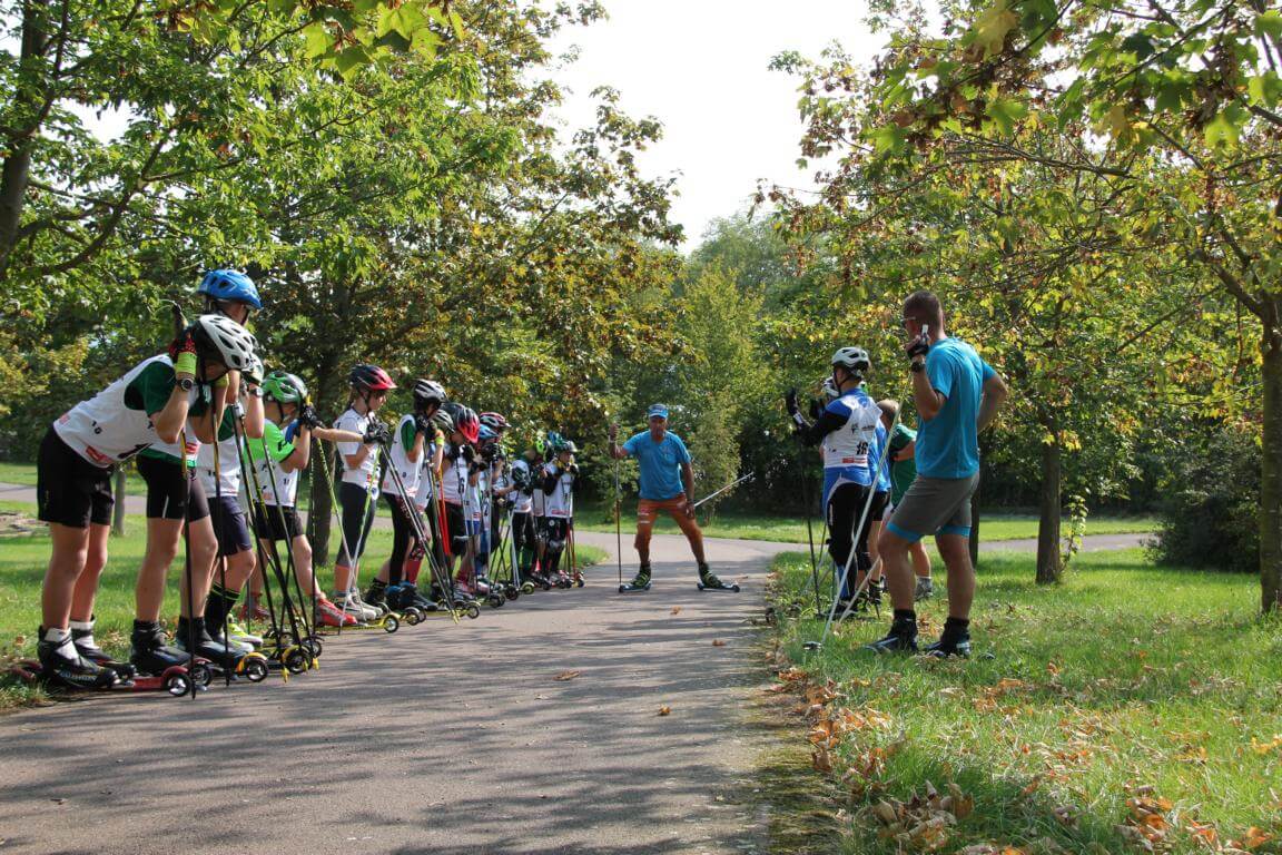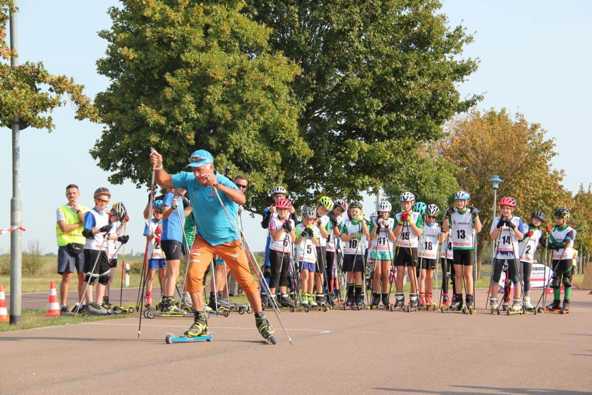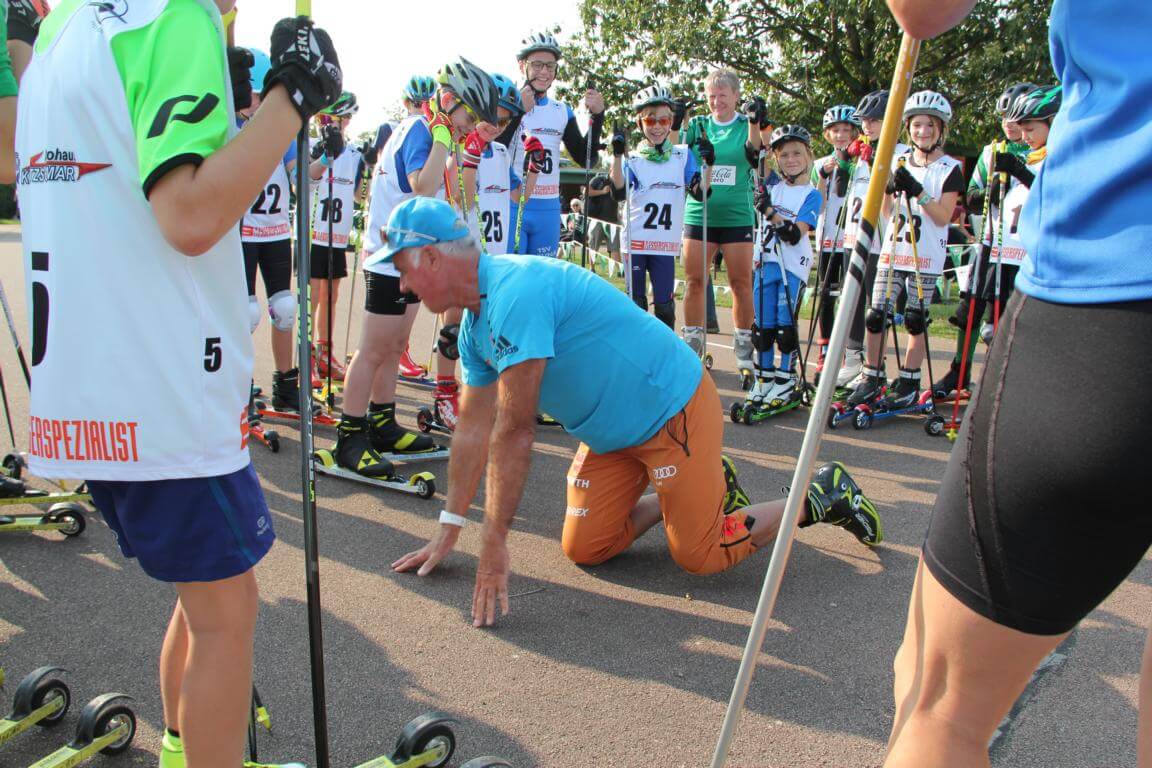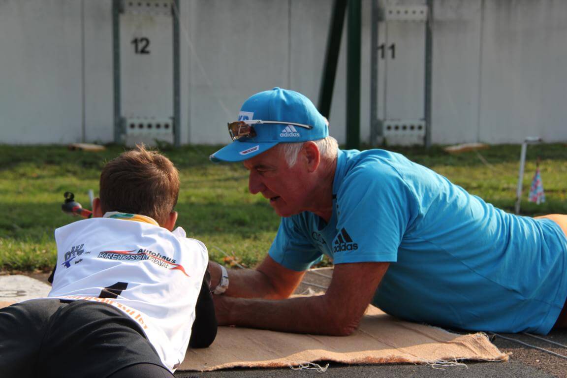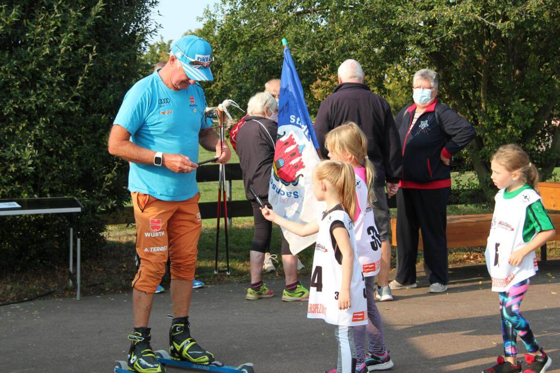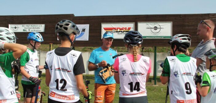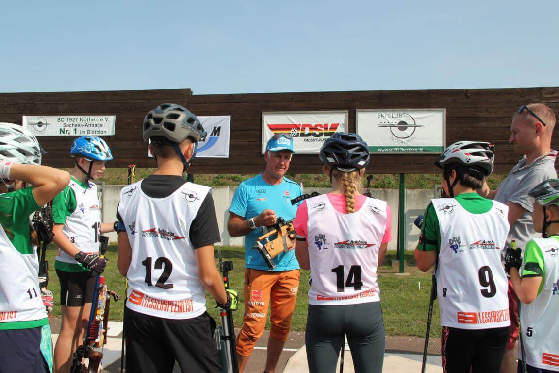 Am 12.9.2020 stand am Seebad Edderitz alles im Zeichen des Biathlons. Biathlonlegende Fritz Fischer (Olympiasieger 1992 in Alberville mit der Staffel und ehemaliger Nationaltrainer) besuchte den Skiclub 1927 Köthen auf seiner Biathlonanlage am Seebad Edderitz. Er war schon etwas überrascht das Biathlon bei uns im Flachland möglich ist. Ihn faszinierte der Enthusiasmus aller Beteiligten, ob Kinder oder Erwachsene. Am Vormittag zeigte Fritz Fischer den Kindern aus Köthen, Leuna und Leipzig einige Kniffe in der Lauftechnik. Dabei machte er alles auf dem Skiroller selbst vor. Danach mussten die Trainer immer als Demonstrationsobjekt herhalten und die Kinder durften mit seiner Hilfe eine Fehleranalyse durchführen. Anschließend wurde alles praktisch selbst ausprobiert. Mit seiner offenen und herzlichen Art war es ein riesiges Erlebnis für Alle. Am Nachmittag wurde mit Fritz Fischer geschossen. Auch alle Biathlonneulinge probierten sich im Biathlonkomplextraining aus und hatten viel Spaß.