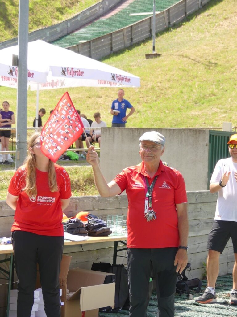 Vor der Siegerehrung gab es noch zwei besondere Ehrungen: mit einer Laudatio wurde Trainer Jürgen Duschek für sein Lebenswerk 50 Jahre als Skisprungtrainer durch den Vereinsvorsitzenden Dr. Alexander Brune und Jugendübungsleiterin Henrike Stoor mit einer ganz besonderen Trainerfahne geehrt. Ein weiteres Dankeschön ging an Dr. Sascha Kreibich und Stephan Kupke, die nun nach 5 Jahren als Leiter-Duo des DSV NordCups das Zepter weiterreichen.