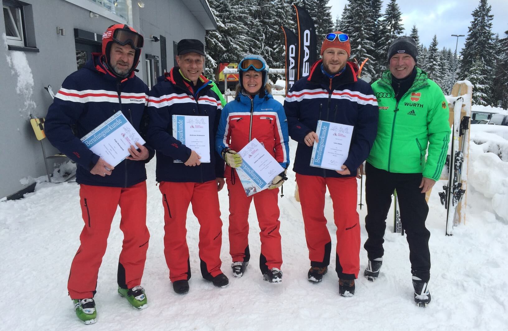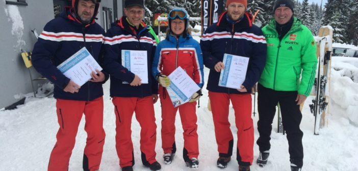 Zünftig verlief die Berufung des neuen SVSA-Lehrteams alpin am Sonntag den 17.12.2017. Bei märchenhaften Schneebedingungen am Wurmberg/Braunlage traf Präsident Dr. Rüdiger Ganske per Langlaufski aus Schiercke am Hexenritt ein, um die Berufung des Lehrteams vorzunehmen. Während der Mittagspause der Fortbildung alpin überreichte er allen neuen Ausbildern die Berufungsurkunden sowie einen Bildband der letzten Ski-WM. Bis auf Dag Schaffarzyk waren alle Lehrteam-Mitglieder versammelt: Ingo Roenspieß, Andreas Hickmann, Sabine Hoffmann, Lars Adam (im Bild v.l.)
