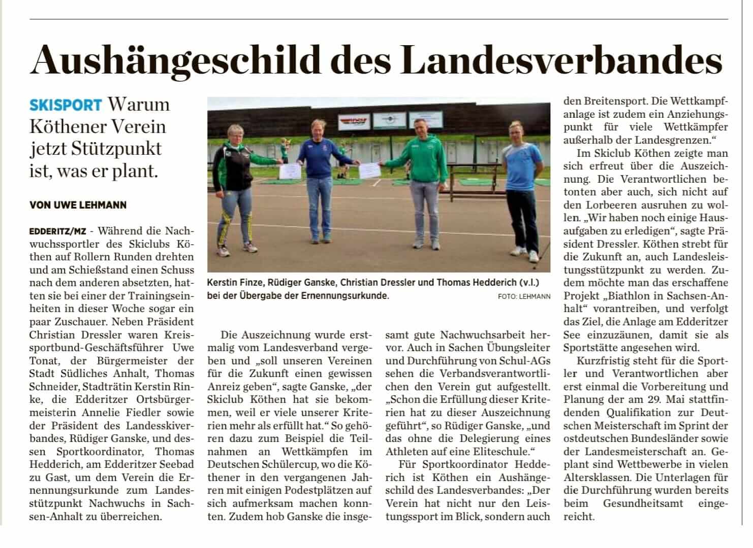 Nachwuchsarbeit zahlt sich aus und verpflichtet zugleich. Am 11.05. wurde der Skiclub 1927 Köthen vom Skiverband Sachsen-Anhalt auf seiner Biathlonanlage am Edderitzer See zum Landesstützpunkt Nachwuchs für 2021/2022 ernannt.