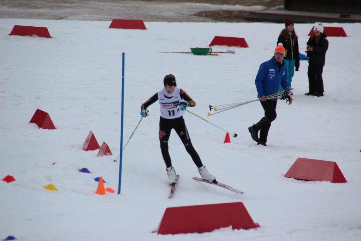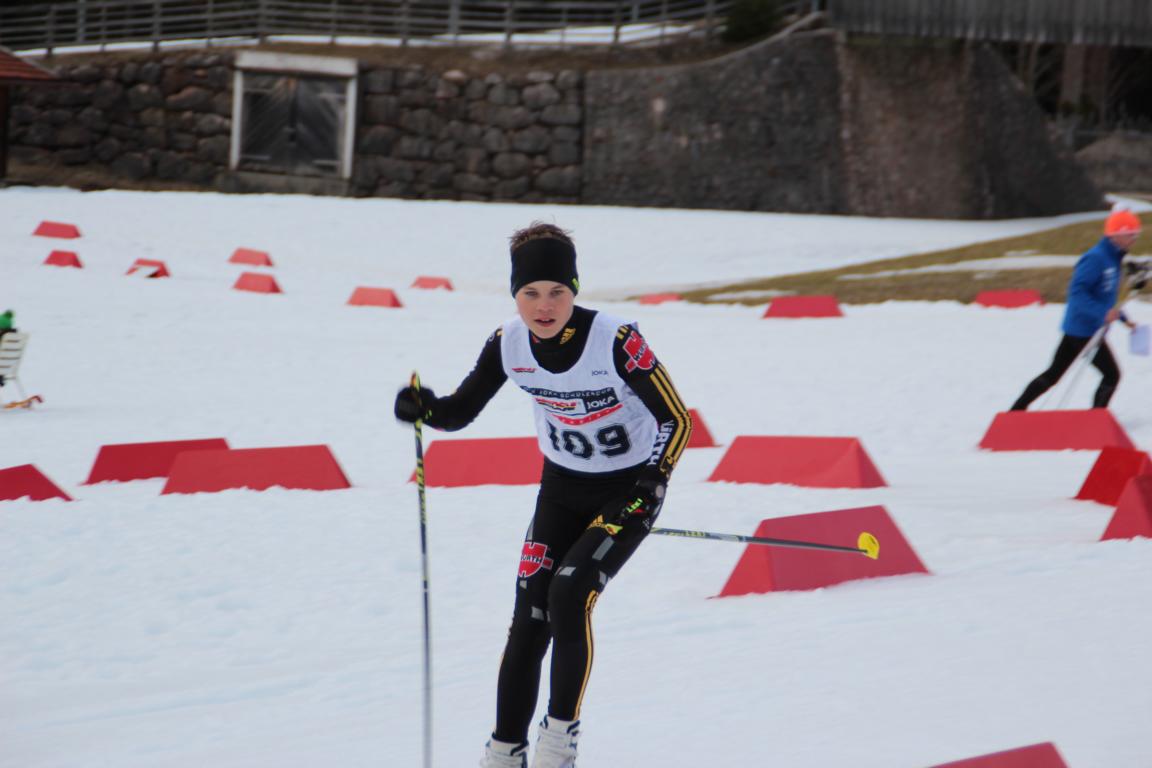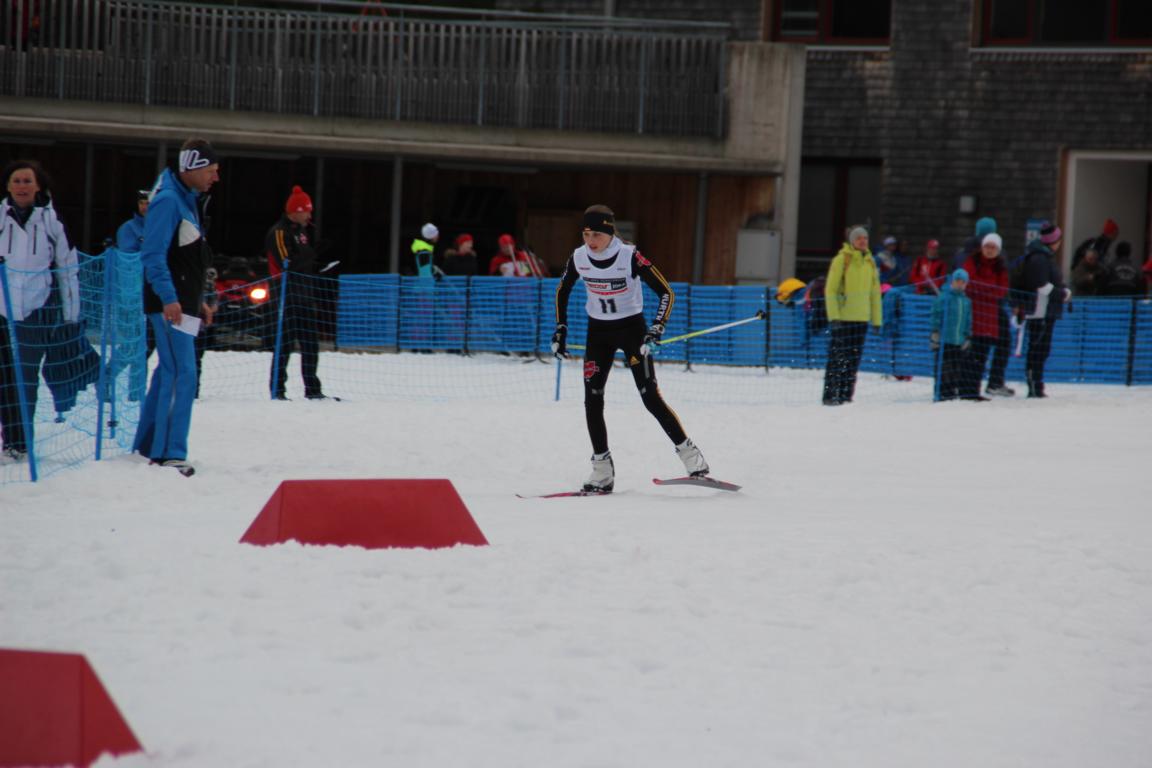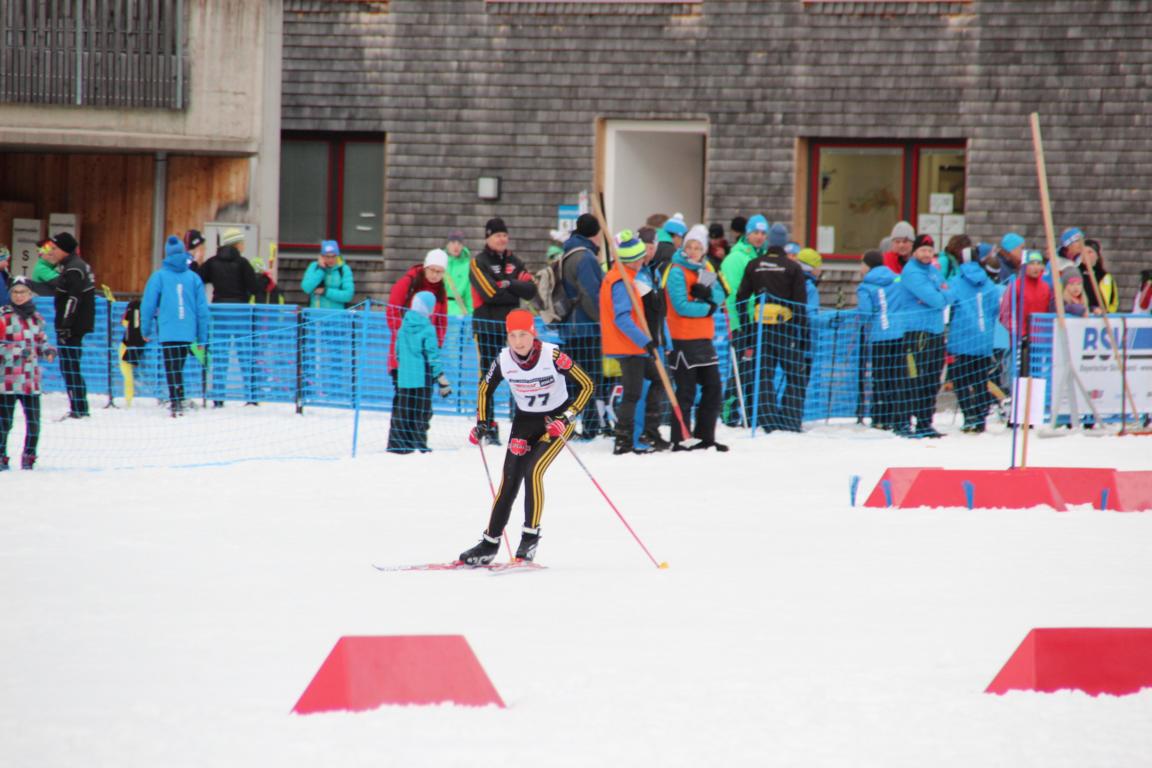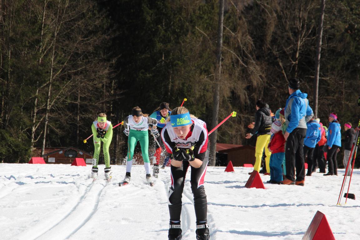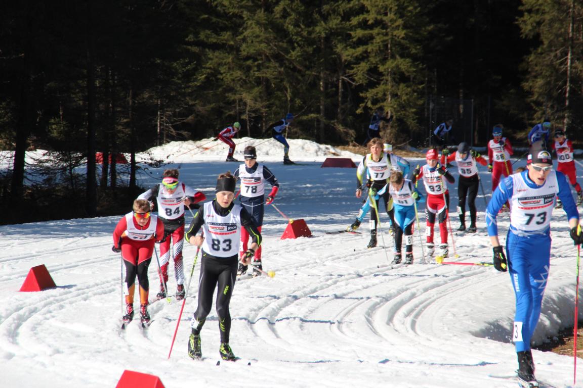 Am Folgetag standen beim Massenstartrennen die längsten Streckenlängen der Saison an. Je nach Altersklasse mussten auf einer 2km Schleife 6, 8 bzw. 10km absolviert werden. Zusätzliches Erschwernis waren die hohen Temperaturen die am Nachmittag den ohnehin durchnässten Schnee aufweichten. Mit Alina Rippin ging die Altersklasse 14 weiblich als erstes ins Rennen. Sie konnte ihre gute Form bestätigen und lief bis zum Schluss um die Medaillenränge mit. Erst am Schlussanstieg konnten sich einige Läuferinnnen um wenige Meter von der Führungsgruppe lösen, bis zur Zielgeraden blieb es aber um jede Platzierung spannend. Schließlich konnte Alina den achten Rang erkämpfen. Mit lediglich 12 Sekunden auf die Siegerin ein abermals zufriedenstellendes Ergebnis für Heimtrainer Thomas Kühlmann und Thomas Hedderich.