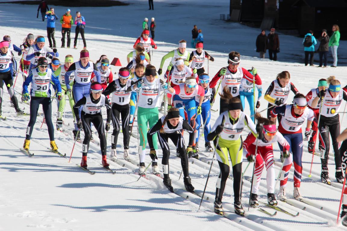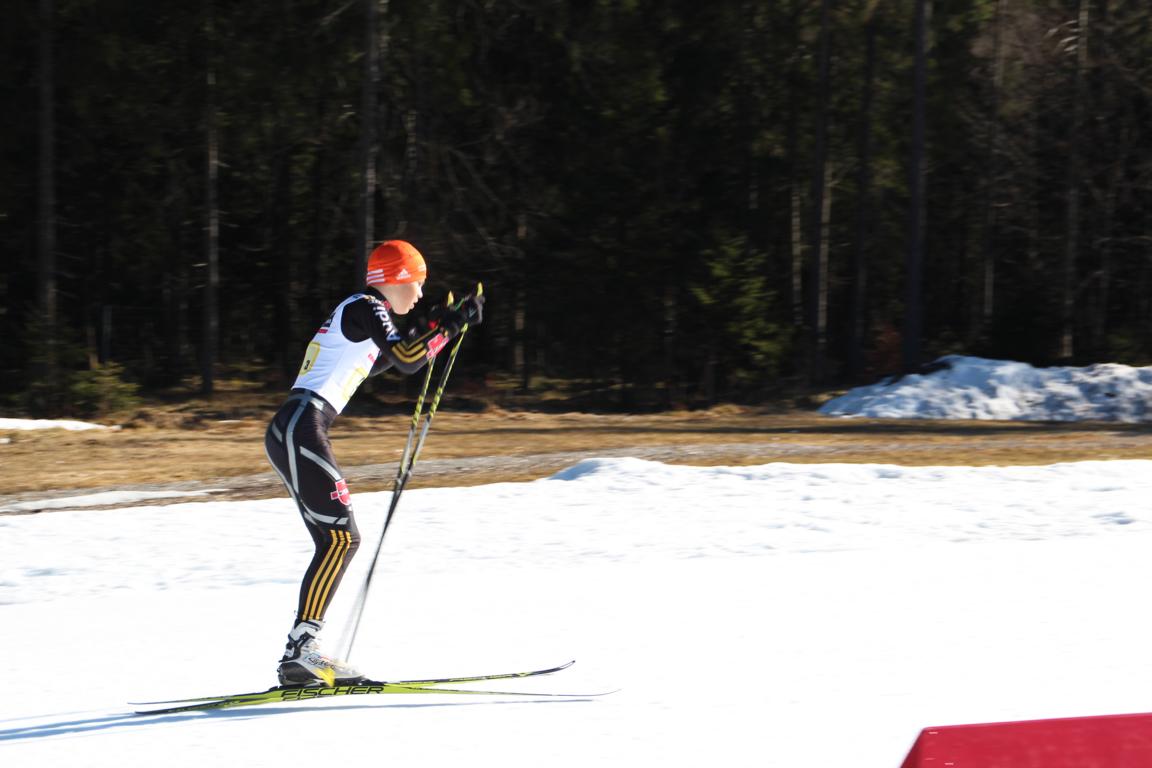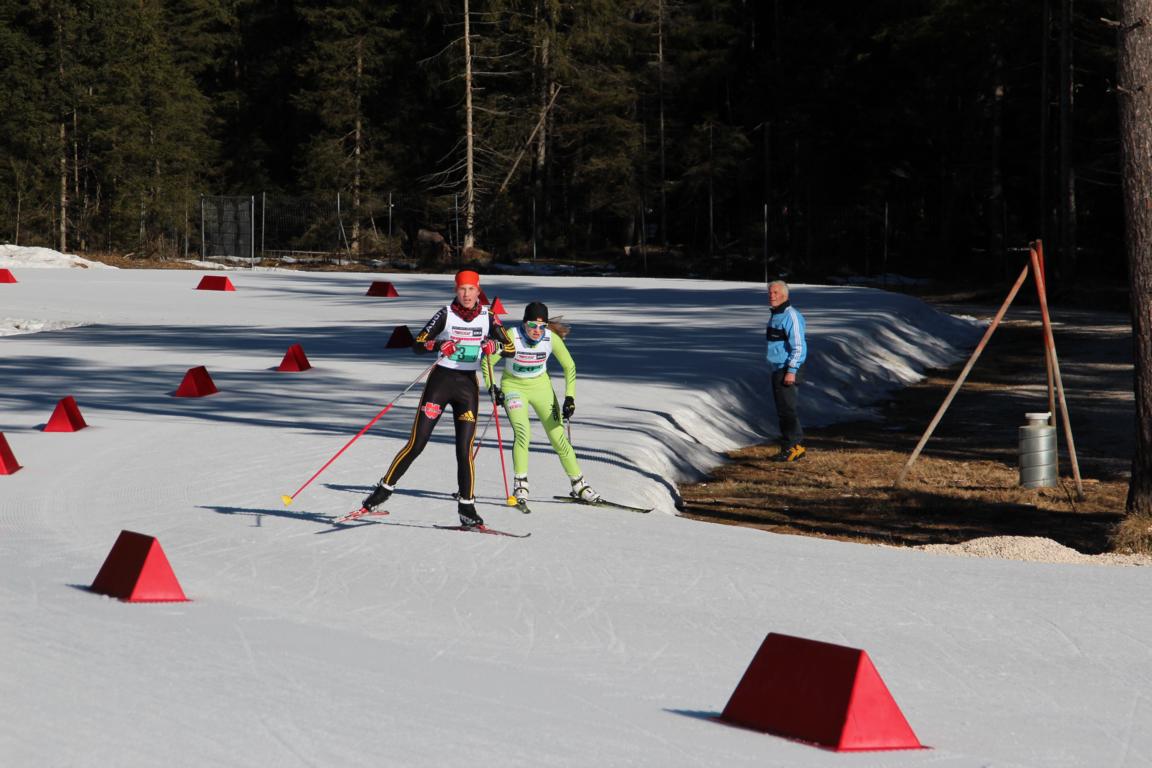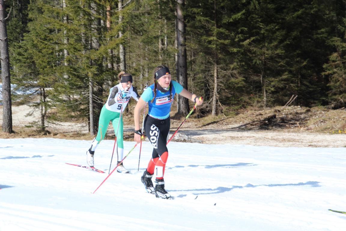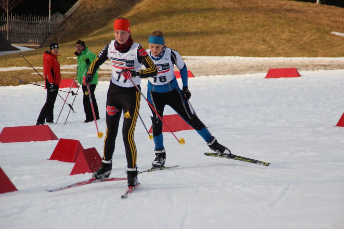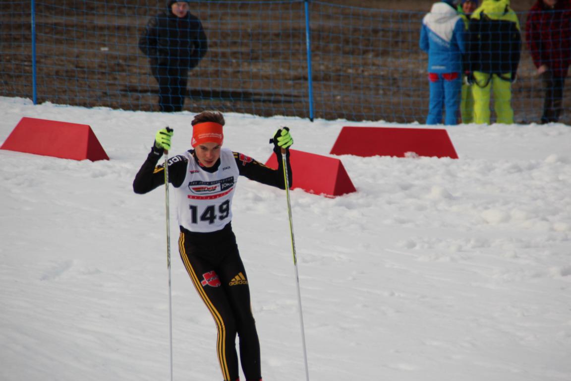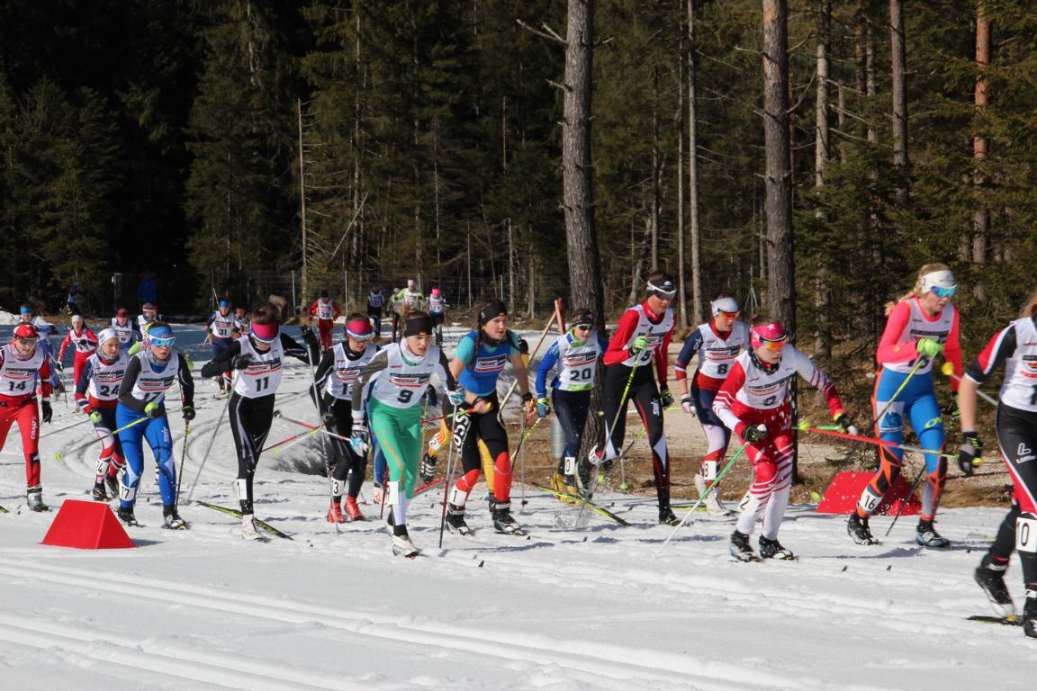 Am Folgetag standen beim Massenstartrennen die längsten Streckenlängen der Saison an. Je nach Altersklasse mussten auf einer 2km Schleife 6, 8 bzw. 10km absolviert werden. Zusätzliches Erschwernis waren die hohen Temperaturen die am Nachmittag den ohnehin durchnässten Schnee aufweichten. Mit Alina Rippin ging die Altersklasse 14 weiblich als erstes ins Rennen. Sie konnte ihre gute Form bestätigen und lief bis zum Schluss um die Medaillenränge mit. Erst am Schlussanstieg konnten sich einige Läuferinnnen um wenige Meter von der Führungsgruppe lösen, bis zur Zielgeraden blieb es aber um jede Platzierung spannend. Schließlich konnte Alina den achten Rang erkämpfen. Mit lediglich 12 Sekunden auf die Siegerin ein abermals zufriedenstellendes Ergebnis für Heimtrainer Thomas Kühlmann und Thomas Hedderich.