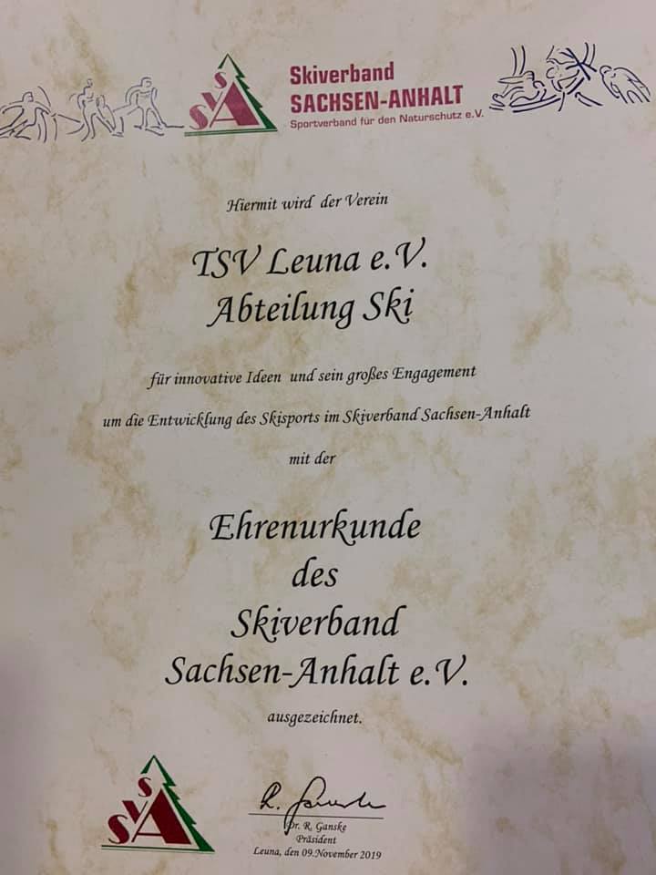 Anlässlich des 100-jährigen Jubiläums des TSV Leuna fand im November die Delegiertenkonferenz 2019 des SVSA in den Räumlichkeiten des Vereins in Leuna statt. Im Mittelpunkt standen neben den Berichten des Präsidiums auch die Ehrungen engagierter Mitglieder. So erhielt der TSV Leuna die Silberne Skispitze des Deutschen Skiverbandes für 100 jähriges Bestehen und wurde darüberhinaus für seine Leistungen und innovativen Ideen im Nachwuchssport ausgezeichnet. Gastgebender Abteilungsleiter Steffen Kohl-Bosdorff und Präsident Jürgen Schulze nahmen die Ehrung dankend im Empfang.