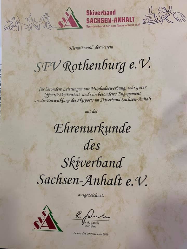 Der SFV Rothenburg, vertreten durch Masters-Skispringer Andreas Teubner, erhielt die Ehrenurkunde des Landesverbandes für die besonderen Leistungen zur Mitgliederwerbung und seine hervorragende Öffentlichkeitsarbeit. Freuen durfte sich auch Karin Grimmecke, die als Vorstandsmitglied des NSV Wernigerode stellvertretend die Ehrung des Vereins für seine Verdienste um die Ausrichtung von Veranstaltungen, wie beispielsweise des DSV Deutschlandpokals, in Empfang nahm.