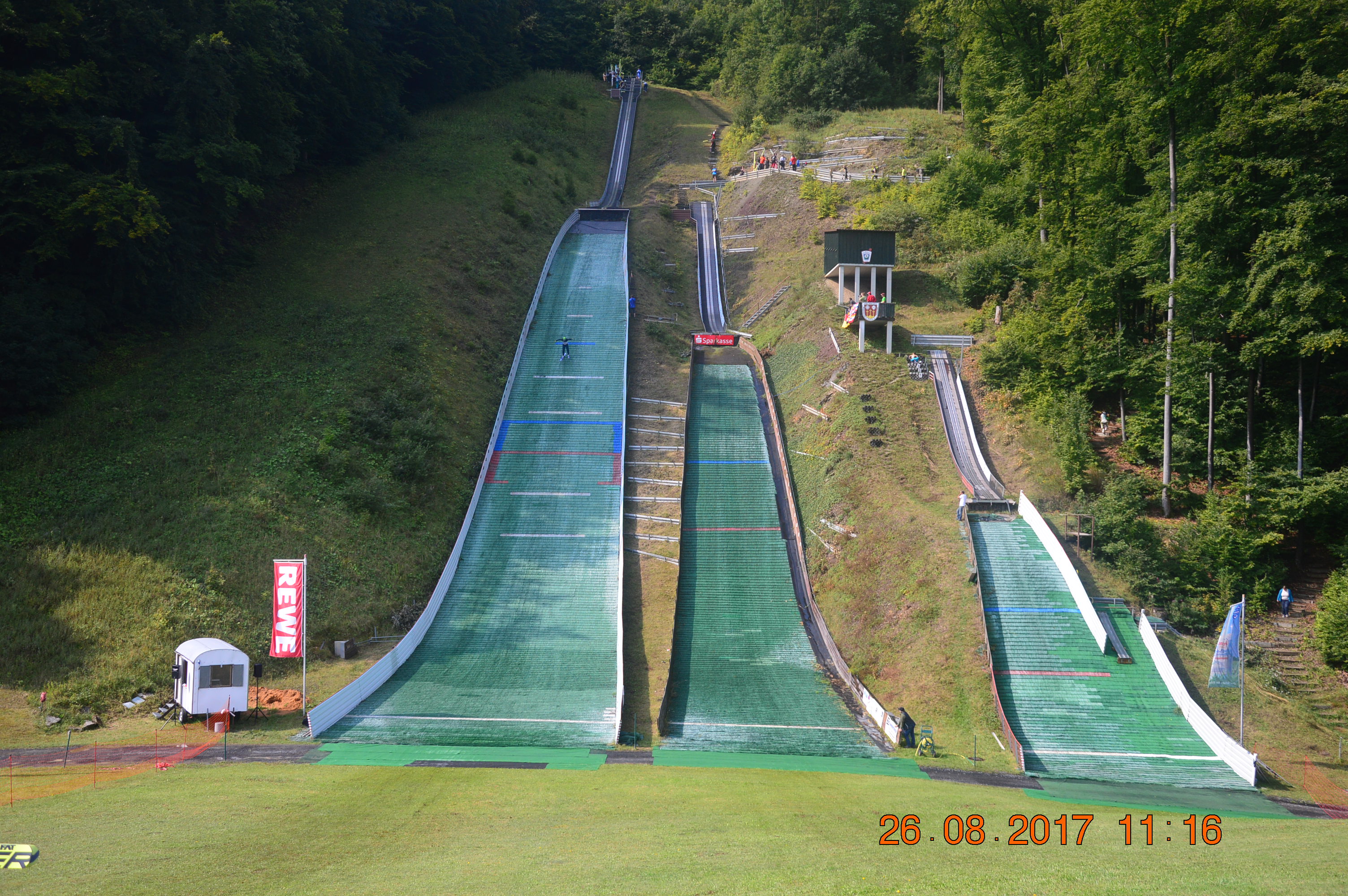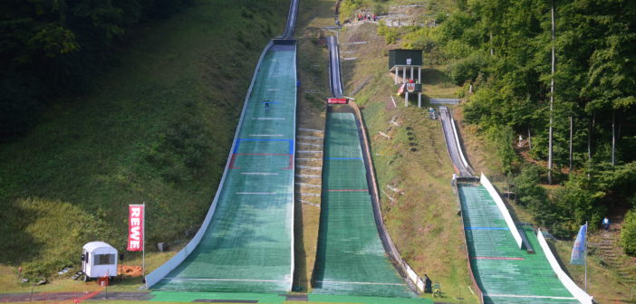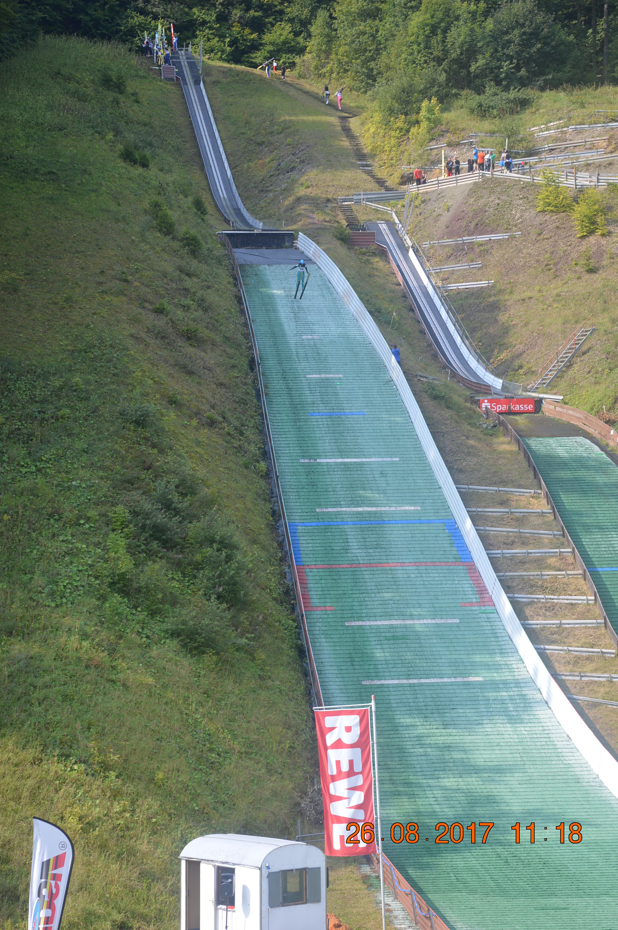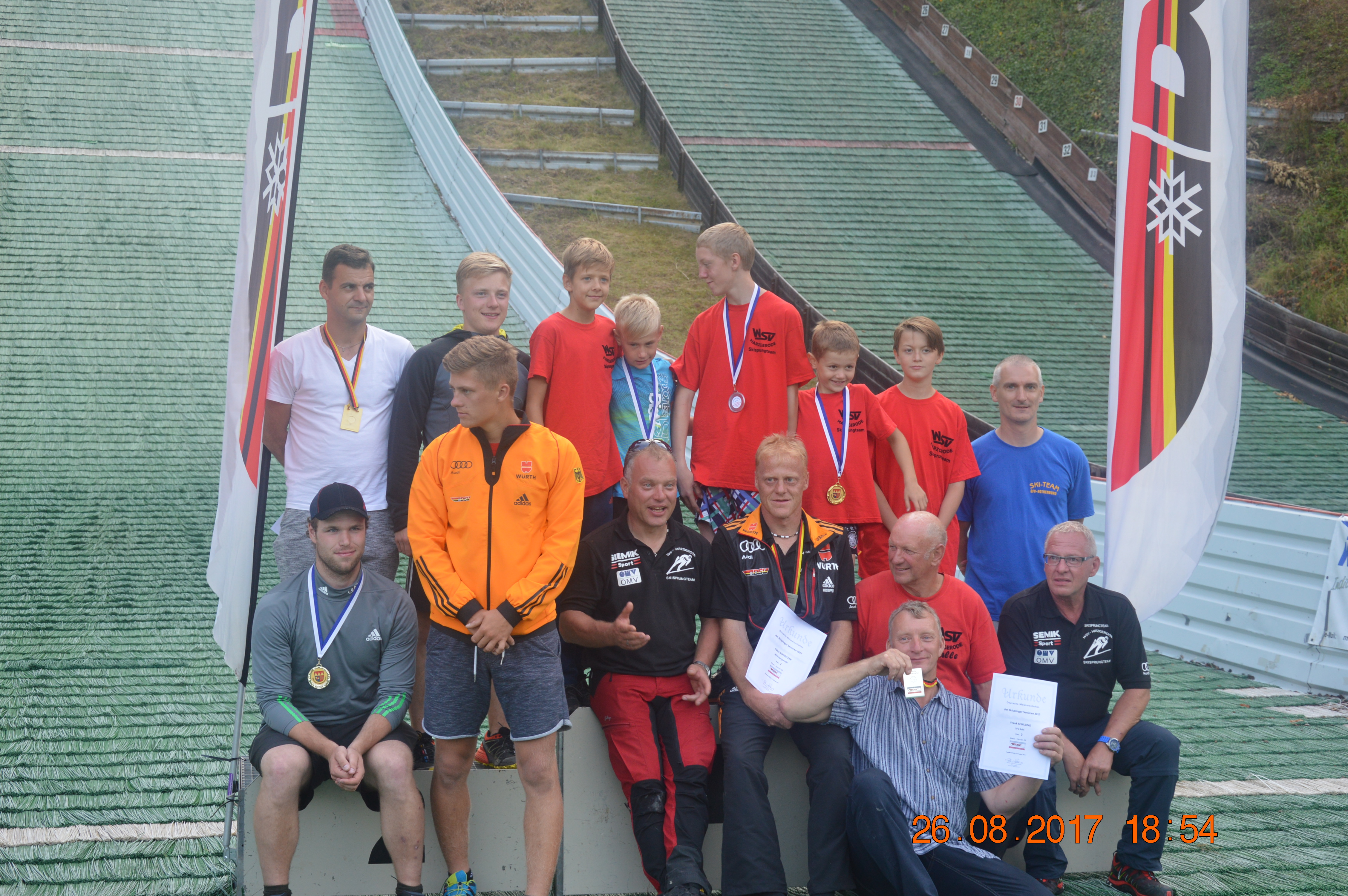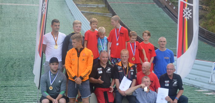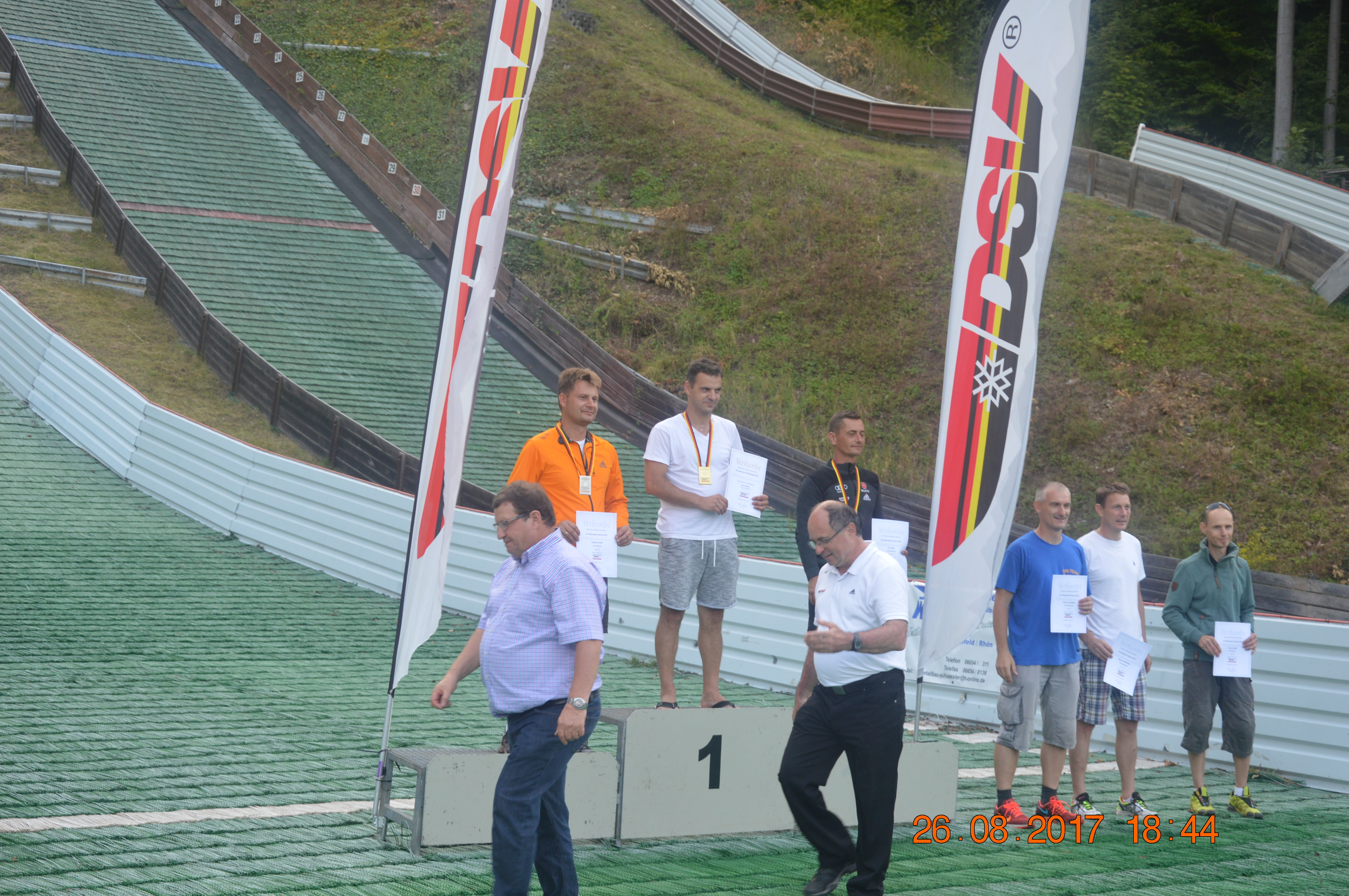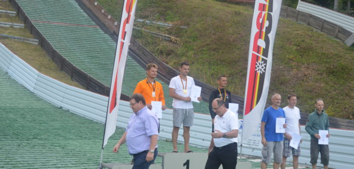 Am Samstag d. 26. August uns Sonntag d. 27. August fanden auf den Kreuzbergschanzen in Haselbach die Deutschen Meisterschaften der Senioren im Skispringen statt. Bei besten sommerlichen Witterungsbedingungen waren spannende Wettkämpfe zu sehen, bei dem die Adler des WSV Harzgerode den SVSA mit tollen Ergebnissen vertreten haben. So siegten Heiko Hackl und Jens Jungk im Einzelspringen in ihrer jeweiligen Altersklasse. Andreas Teubner vom SFV Rothenburg verpasste mit Rang vier das Podest nur knapp um 0,8 Punkte. Die ältesten Teilnehmer der insgesamt 70 Starter waren immer hin 71 (50-m-Schanze) und 73 Jahre (30 m-Schanze) alt. Am Sonntag gelang der Mannschaft des WSV Harzgerode in der Besetzung Falko Schmelzer, Heiko Hackl und Jens Junck mit 20 bzw. 98 Punkten Vorsprung vor Dittersbach und Eilenburg sogar der Sieg im Team-Wettbewerb!